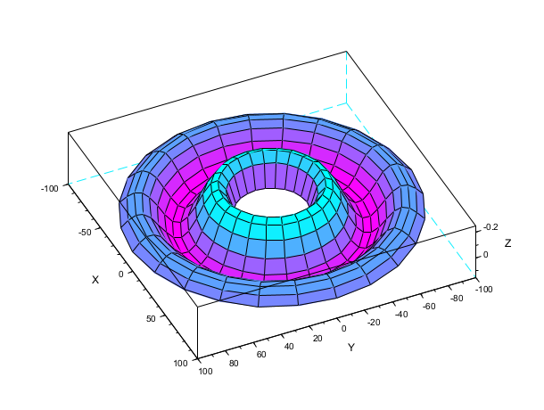 theta = 0:15:360; r = 25:5:100; [R,T] = ndgrid(r,theta); X = R.*cosd(T); Y = R.* sind(T); Z = sinc(R/8); clf surf(X, Y, Z) gcf().color_map = cool(50); gca().rotation_angles=[195 -155];