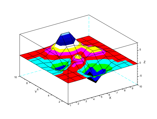 //LineSpec および GlobalProperty の例: Z= [ 0.0001 0.0013 0.0053 -0.0299 -0.1809 -0.2465 -0.1100 -0.0168 -0.0008 -0.0000 0.0005 0.0089 0.0259 -0.3673 -1.8670 -2.4736 -1.0866 -0.1602 -0.0067 0.0000 0.0004 0.0214 0.1739 -0.3147 -4.0919 -6.4101 -2.7589 -0.2779 0.0131 0.0020 -0.0088 -0.0871 0.0364 1.8559 1.4995 -2.2171 -0.2729 0.8368 0.2016 0.0130 -0.0308 -0.4313 -1.7334 -0.1148 3.0731 0.4444 2.6145 2.4410 0.4877 0.0301 -0.0336 -0.4990 -2.3552 -2.1722 0.8856 -0.0531 2.6416 2.4064 0.4771 0.0294 -0.0137 -0.1967 -0.8083 0.2289 3.3983 3.1955 2.4338 1.2129 0.2108 0.0125 -0.0014 -0.0017 0.3189 2.7414 7.1622 7.1361 3.1242 0.6633 0.0674 0.0030 0.0002 0.0104 0.1733 1.0852 2.6741 2.6725 1.1119 0.1973 0.0152 0.0005 0.0000 0.0012 0.0183 0.1099 0.2684 0.2683 0.1107 0.0190 0.0014 0.0000]; close(winsid()) // 既存の図を全て削除 e = surf(Z,Z+5) // colors 配列を指定 e.cdata_mapping='direct' // デフォルトはカラーマップに関して 'scaled' r e.color_flag=3; // 補間影モード. surf のデフォルトは 4 ('flat' モード)