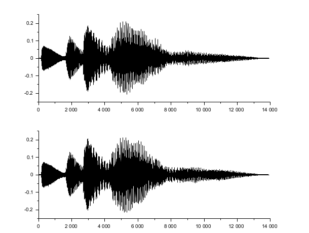 File = "SCI/modules/sound/demos/chimes.wav"; wavread(File, "size") wavread(File, "info") y = wavread(File, 5) // 最初の5サンプル y = wavread(File, [4 7]) // only samples #4 to #7 [y, Fs, bits] = wavread(File); Fs, bits clf subplot(2,1,1) plot2d(y(1,:)) // 最初のチャネル subplot(2,1,2) plot2d(y(2,:)) // 2番目のチャネル