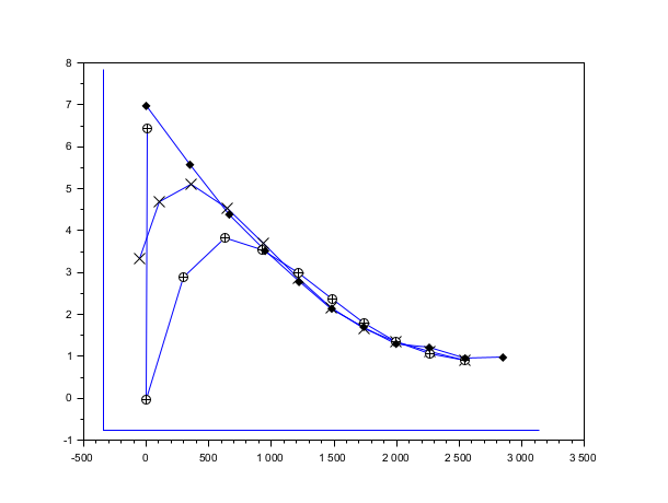 // 統計量(平均および誤差共分散)を初期化 m0=[10 10]'; p0=[100 0;0 100]; // システムを生成 f=[1.1 50.1;0 0.8]; g=[1 0;0 1]; h=[1 0;0 1]; [hi,hj]=size(h); // ノイズの統計量 q=[.01 0;0 0.01]; r=20*eye(2,2); // システム過程を初期化 rand("seed",66); p0c=chol(p0); x0=m0+p0c'*rand(ones(m0), "normal"); y=h*x0+chol(r)'*rand(ones(1:hi), "normal")'; yt=y; // プロットする変数を初期化 x=x0; // ループ ft=[f]; gt=[g]; ht=[h]; qt=[q]; rt=[r]; n=10; for k=1:n // 状態変数と観測量を // 時刻 k (すなわち xk および yk) で生成 [x1,y]=system(x0,f,g,h,q,r); x=[x x1]; yt=[yt y]; x0=x1; ft=[ft f]; gt=[gt g]; ht=[ht h]; qt=[qt q]; rt=[rt r]; end // ウィナーフィルタ推定を得る [xs,ps,xf,pf]=wiener(yt,m0,p0,ft,gt,ht,qt,rt); // 結果をプロット a=min([x(1,:)-2*sqrt(ps(1,1:2:2*(n+1))),xf(1,:),xs(1,:)]); b=max([x(1,:)+2*sqrt(ps(1,1:2:2*(n+1))),xf(1,:),xs(1,:)]); c=min([x(2,:)-2*sqrt(ps(2,2:2:2*(n+1))),xf(2,:),xs(2,:)]); d=max([x(2,:)+2*sqrt(ps(2,2:2:2*(n+1))),xf(2,:),xs(2,:)]); xmargin=max([abs(a),abs(b)]); ymargin=max([abs(c),abs(d)]); a=-0.1*xmargin+a; b=.1*xmargin+b; c=-0.1*ymargin+c; d=.1*ymargin+d; // フレーム, 状態変数 (x), および推定値 (xf, および xs)をプロット scf(); plot([a a b],[d c c]); plot2d(x(1,:)',x(2,:)',[2],"000") plot2d(xf(1,:)',xf(2,:)',[2],"000") plot2d(xs(1,:)',xs(2,:)',[2],"000") // データ点をマーク (実データ: * , 推定値: o) plot2d(xs(1,:)',xs(2,:)',[-2],"000") plot2d(xf(1,:)',xf(2,:)',[-3],"000") plot2d(x(1,:)',x(2,:)',[-4],"000")