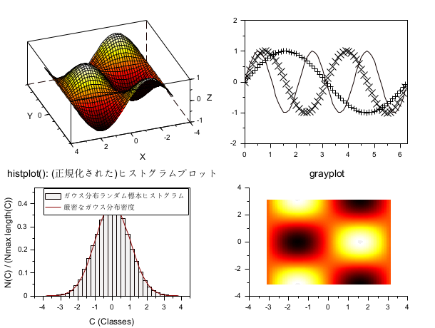 // 4つのプロットを一つのグラフィックウインドウにプロットします clf() set(gca(),"font_style",2,"font_size",0); xsetech([0,0,0.5,0.5]); plot3d() xsetech([0.5,0,0.5,0.5]); plot2d() xsetech([0.5,0.5,0.5,0.5]); grayplot() xsetech([0,0.5,0.5,0.5]); histplot() // サブウインドウのデフォルト値に戻します xsetech([0,0,1,1])