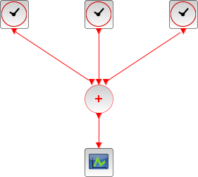 This block is an event addition block with up to three inputs. The output reproduces the events on all the input ports. Strictly speaking, CLKSOMV is not a Xcos block because it is discarded at the compilation phase. The inputs and output of CLKSOMV are synchronized.