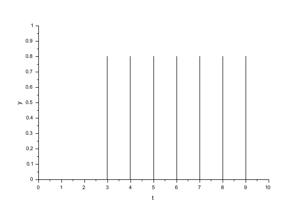 The unique output of this block generates a regular train of events that are scheduled by parameter Period in seconds. The starting date of events generation can be set in seconds with the Initialisation Time parameter.