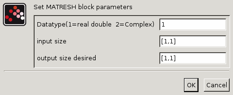 The RESHAPE block changes the dimensions of a matrix or a vector to another dimensions specified by the user in the output size desired parameter.The dimensions of the output must be less or equal to the input size given by the input size parameter.