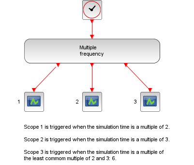 This blocks generates events at specific sample time of the simulation time. The sample time is given in the "Sample Time" field and the offset is given in the "Offset" field. This block has one event input, the number of event outputs depends on the number of different sample time. For example if the vector of sample time is [1 1 2] and the vector of offset is [0 .5 0] then the block has 7 outputs.