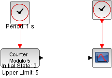 It is a discrete block. The block outputs a periodic scalar piecewise constant signal. Signal begin at Initial State value. The output is incremented when block received an event on its activation input until output reaches the Upper Limit parameter value. At this time the output is reset to 0. For a periodic event input, the output is a quantized sawtooth signal.