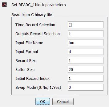 This block allows user to read data in a C file. Output record selection and Time record Selection allows the user to select data among file records. Each call to the block advance one record in the file.