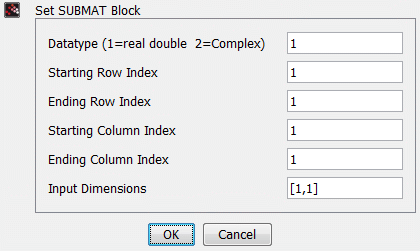 This block outputs a sub matrix of the input matrix. The dimensions of the input matrix are specified in the Input Dimension parameter. The user gives the range of extraction with four parameters: