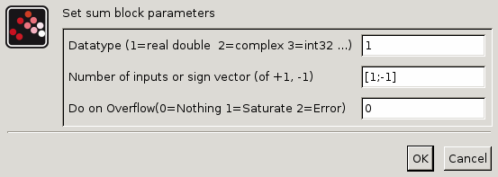 | Two or more | y = k[1]*u1+k[2]*u2+...+k[N]*uN | k is the scalar or vector value write in the Number of inputs or sign vector parameter. For the addition of all inputs, simply set this parameter to the number of inputs. To add/subtract the input ui, set in this parameter a vector k with k[i] = +1 (addition) or -1 (subtraction) for the input ui. |