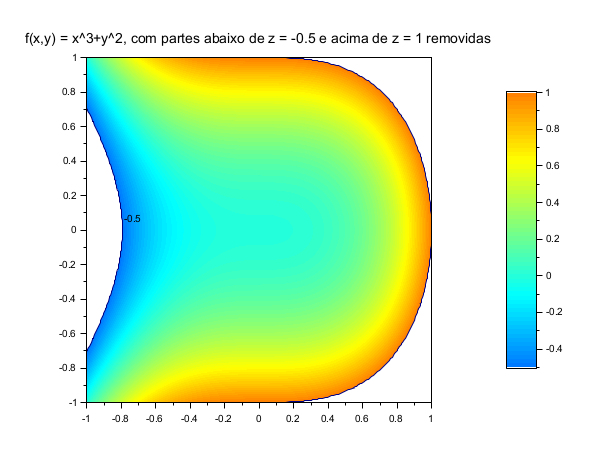 // exemplo #3: esboço de surf3 e uso dos argumentos opcionais zminmax e colout // para restringir o esboço em -0.5<= z <= 1 function z=surf3(x, y), z=x^3+y^2, endfunction clf() x = linspace(-1,1,60); y = linspace(-1,1,60); set(gcf(),"color_map",jet(128)) drawlater(); zminmax = [-0.5 1]; colors=[32 96]; colorbar(zminmax(1),zminmax(2),colors) Sfgrayplot(x, y, surf3, strf="041", zminmax=zminmax, colout=[0 0], colminmax=colors) contour2d(x,y,surf3,[-0.5, 1],style=[1 1 1],strf="000") xtitle("f(x,y) = x^3+y^2, com partes abaixo de z = -0.5 e acima de z = 1 removidas") drawnow(); show_window()