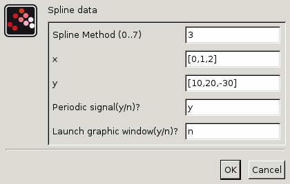 • Spline method (0…7) : Accepted values are 0, 1, 2, 3, 4, 5, 6 or 7. This parameter defines the spline method for interpolating the points. The Signal builder block computes a linear or a cubic spline or sub-spline S which interpolates the (xi,yi) points, i.e., we have S(xi) = yi for all i=1,…,n. Available methods are described here-below: