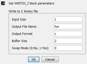 This block allows to user to write data in a C binary file with the name defined by the string Output File Name. The file is a sequence of records. Each record has the length fixed by the parameter Input Size and the structure shown below: