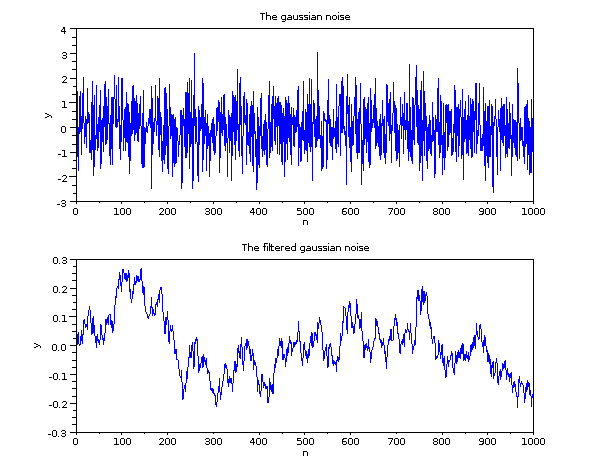 rand('normal'); Input = rand(1,1000); // Produce a random gaussian noise t = 1:1000; sl= tf2ss(hz); // From transfert function to syslin representation y = flts(Input,sl); // Filter the signal subplot(2,1,1); plot(t,Input); xtitle('The gaussian noise','t','y'); subplot(2,1,2); plot(t,y); xtitle('The filtered gaussian noise','t','y');