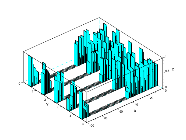 Z = zeros(100,5); A = abs(rand(40,5)); Z(1:40,:) = A; A = abs(rand(10,5)); Z(91:100,:) = A; clf bar3d(Z) isoview off