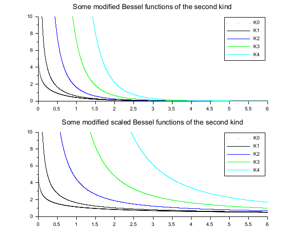 // Funções K de Bessel // ================= x = linspace(0.01,10,5000)'; clf() subplot(2,1,1) plot2d(x,besselk(0:4,x), style=0:4, rect=[0,0,6,10]) legend('K'+string(0:4),1); xtitle("Algumas funções modificadas de Bessel do segundo tipo") subplot(2,1,2) plot2d(x,besselk(0:4,x,1), style=0:4, rect=[0,0,6,10]) legend('K'+string(0:4),1); xtitle("Algumas funções modificadas de Bessel do segundo tipo escaladas")