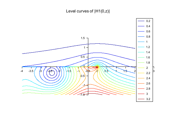 // Funções H de Bessel // ================= x=-4:0.025:2; y=-1.5:0.025:1.5; [X,Y] = ndgrid(x,y); H = besselh(0,1,X+%i*Y); clf();f=gcf(); f.color_map=jet(16); contour2d(x,y,abs(H),0.2:0.2:3.2,strf="034",rect=[-4,-1.5,3,1.5],fpf=" ") legends(string(0.2:0.2:3.2),1:16,"ur") xtitle("Curvas de nível de |H1(0,z)|")