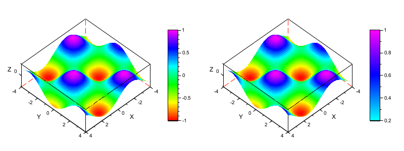 function plotSample() t=[-4:0.1:4]; e = plot3d(t,t,sin(t)'*cos(t)); e.color_flag = 1; e.color_mode = -2; endfunction clf gcf().color_map = rainbow(200); gcf().axes_size = [800 300]; // 5.1) Bar graduated from minU=-1 to maxU=1 with the full colormap subplot(1,2,1) plotSample(); colorbar; // 5.2) Consistent U/colors fractional selection (top 40%) subplot(1,2,2) plotSample(); colorbar(,,[0.6 1]); gcf().children([2 4]).rotation_angles = [55 45];
