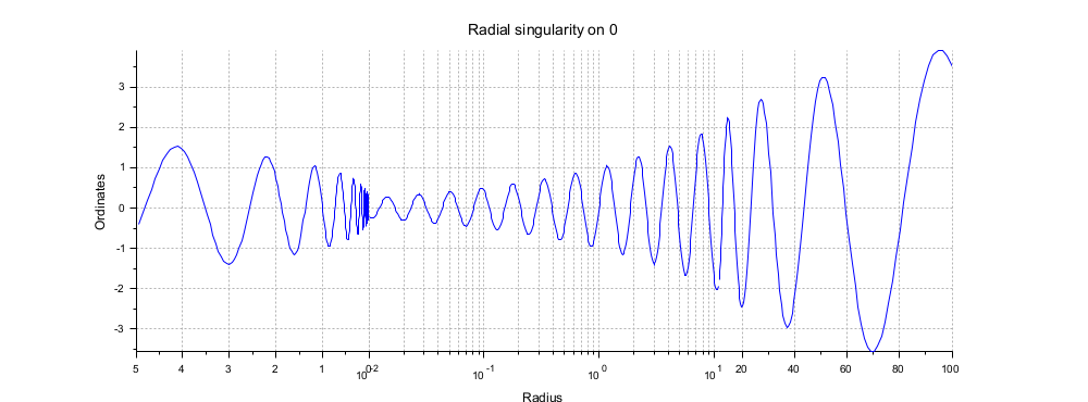 x = logspace(-2,2,500)'; y = sin(10*log(x)).*(x.^0.3); gcf().axes_size = [1000 370]; clf intervals = [5 0 ; 0.01 11 ; 11 max(x)]; a = cutaxes(x, y, "x", intervals, "widths", -[2 3 2]); a(2).log_flags = "lnn"; a(2).sub_ticks(1) = 8; title "Radial singularity on 0" ylabel Ordinates xlabel(a(2), "Radius")