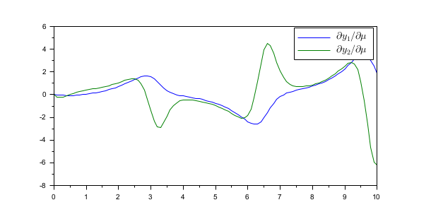 When using a Scilab function, fun has the prototype dydt = fun(t,y,p,...). Here is an example where we compute the sensitivity of the solution of the Van Der Pol equation with respect to parameter mu:
