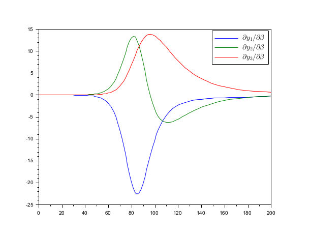 function dydt=sir(t, y, p) β = p(2); γ = p(3); dydt = [-β*y(1)*y(2) β*y(1)*y(2)-γ*y(2) γ*y(2)]; end y20 = 1e-6; β = 0.2; γ = 0.05; y0 = [1-y20; y20; 0]; [t,y,info] = cvode(sir, [0 200], y0, sensPar = [y20;β;γ], yS0 = [-1 0 0 ;1 0 0;0 0 0], method="BDF"); plot(t',squeeze(info.s(2,2:3,:))') legend("$\Large\partial y_2/\partial"+["\beta","\gamma"]+"$");
