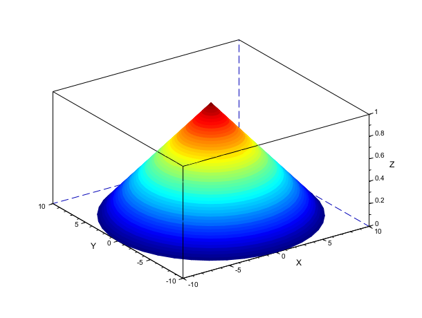 scf(); [x, y, z] = cylinder(10:-0.2:0, 40); surf(x, y, z, "LineStyle", "none"); gcf().color_map = jet(64);