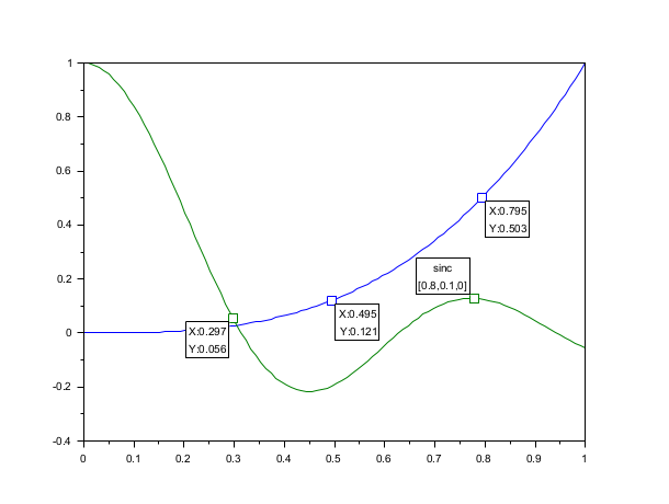 // these examples show how to manage tips by program x1=linspace(0,1,100)'; y1=x1.^3; clf(); e=plot(x1,y1,x1,sinc(10*x1)); p1=e(1)//sinc(10*x1) p2=e(2); //x1^3 t=datatipCreate(p1,50); datatipSetOrientation(t,"lower right") t=datatipCreate(p1,[0.8 0.5]); t=datatipCreate(p2,[0.1,0.0]); t=datatipCreate(p2,[0.8 0.4]); datatipSetOrientation(t,"upper left") function str=myfmt(h) pt = h.data; str = msprintf('sinc\n%s', sci2exp(round(pt*10)/10)) endfunction datatipSetDisplay(t,"myfmt")