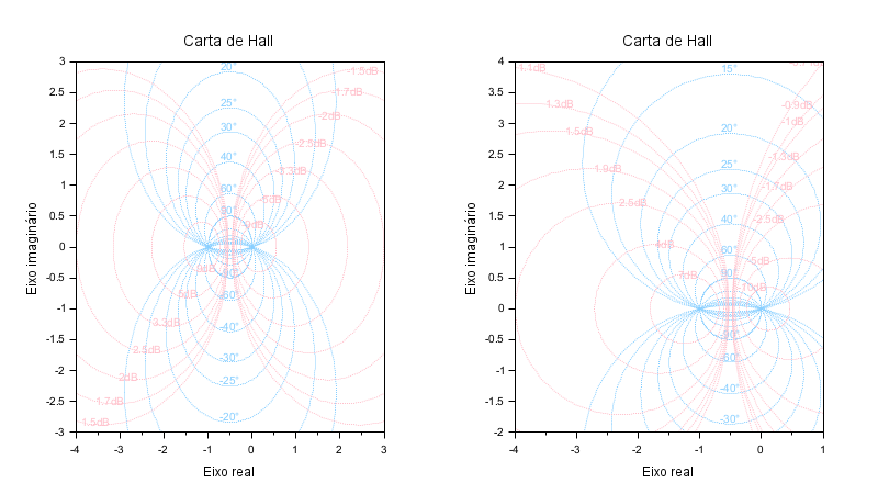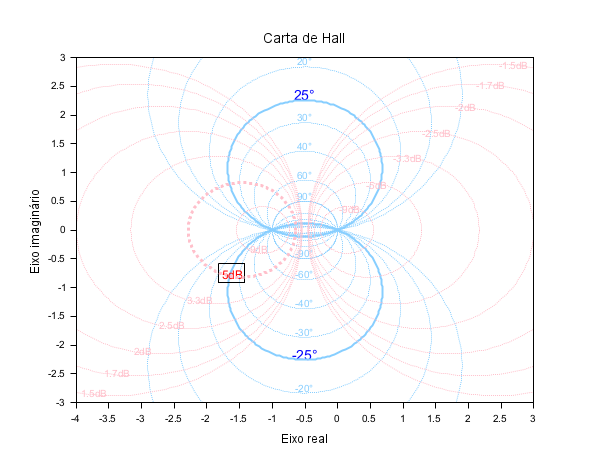 clf h = hallchart(); // 5dB isogain i = find(h.gainLabels.text=="5dB"); // Customizing the label set(h.gainLabels(i),"box","on","font_size",2,"font_foreground",color("red")); // Customizing the line h.gainLines(i).thickness = 3; // +/-25° isophases i = grep(h.phaseLabels.text,"25°") // Customizing the labels set(h.phaseLabels(i),"font_size",3,"font_foreground",color("blue")); // Customizing the lines set(h.phaseLines(i), "thickness",2,"line_style",1);