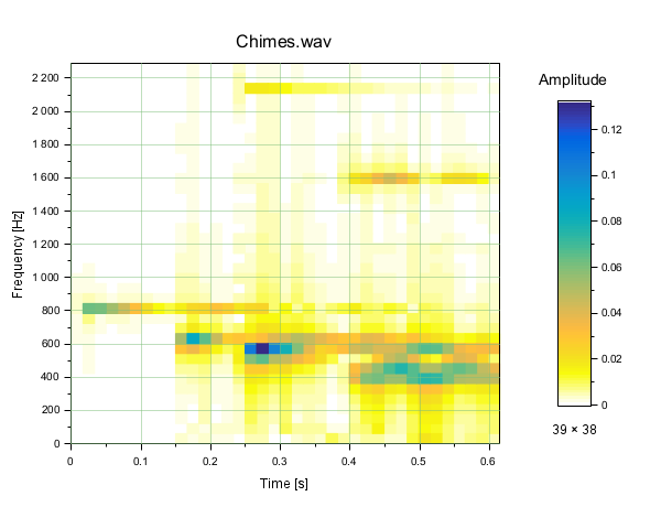 [s1, fs1] = wavread('SCI/modules/sound/demos/chimes.wav'); playsnd([]), sleep(500), playsnd(s1/2), sleep(1000) clf mapsound(s1,, 2300, , parula) title Chimes.wav fontsize 3.5