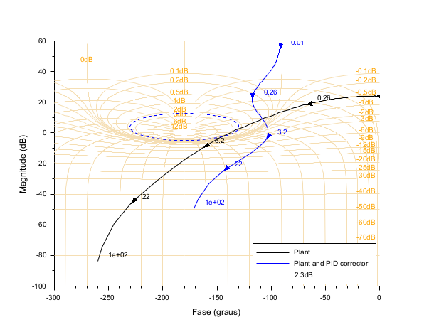 //Black diagram with Nichols chart as a grid s = poly(0,'s'); Plant = syslin('c',16000/((s+1)*(s+10)*(s+100))); //two degree of freedom PID tau = 0.2; xsi = 1.2; PID = syslin('c',(1/(2*xsi*tau*s))*(1+2*xsi*tau*s+tau^2*s^2)); clf() black([Plant;Plant*PID ],0.01,100,["Plant";"Plant and PID corrector"]); //move the caption in the lower right corner gca().children(1).legend_location="in_lower_right"; // Add the Nichols frame and tune its labels color h = nicholschart(); h.phaseFrame.foreground = color("wheat"); h.gainFrame.foreground = color("wheat"); h.gainLabels.font_foreground = color("orange");