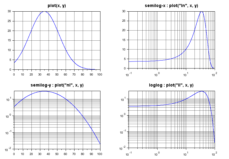 gda().grid = [1 1]*color("grey70"); title(gda(), "fontsize", 3, "color", "lightseagreen", "fontname", "helvetica bold"); x = linspace(1e-1,100,1000); xm = 35; dx = 17; G = exp(-((x-xm)/dx).^2/2)*30; scf(1); clf subplot(2,2,1), plot(x, G), title("plot(x, y)") subplot(2,2,2), plot("ln", x, G), title("semilog-x : plot(""ln"", x, y)"); gca().sub_ticks(1) = 8; subplot(2,2,3), plot("nl", x, G), title("semilog-y : plot(""nl"", x, y)"); gca().sub_ticks(2) = 8; subplot(2,2,4), plot("ll", x, G), title("loglog : plot(""ll"", x, y)"); gca().sub_ticks = [8 8]; sda();