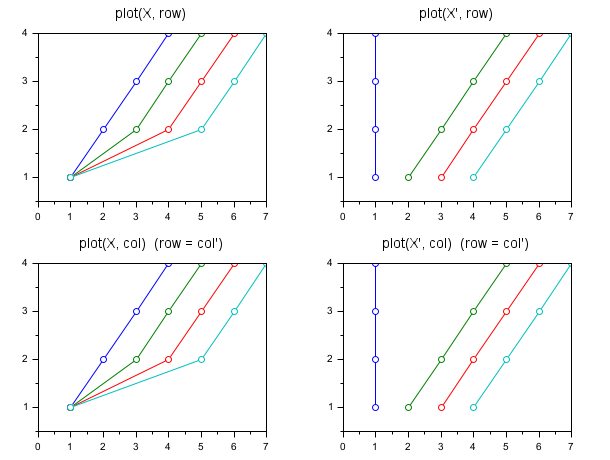 clf X = [1 1 1 1 2 3 4 5 3 4 5 6 4 5 6 7]; y = [1 2 3 4]; subplot(221), plot(X, y, "o-"), title("plot(X, row)", "fontsize",3) // equivalent to plot(t, [1 1 1 1; 2 2 2 2; 3 3 3 3; 4 4 4 4]) subplot(223), plot(X, y', "o-"), title("plot(X, col) (row = col'')", "fontsize",3) subplot(222), plot(X',y, "o-"), title("plot(X'', row)", "fontsize",3) subplot(224), plot(X',y', "o-"), title("plot(X'', col) (row = col'')", "fontsize",3) for i = 1:4, gcf().children(i).data_bounds([1 3]) = 0.5; end