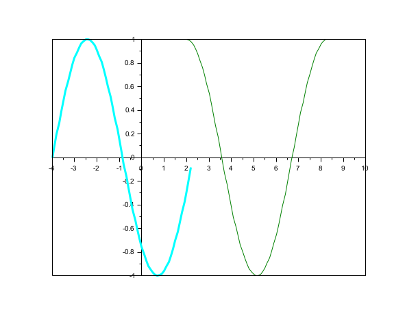 x=[0:0.1:2*%pi]'; plot(x-4,sin(x),x+2,cos(x)) // axis centered at (0,0) a=gca(); // Handle on axes entity a.x_location = "origin"; a.y_location = "right"; isoview on // Some operations on entities created by plot ... a.children // list the children of the axes : here it is an Compound child composed of 2 entities poly1= a.children.children(2); //store polyline handle into poly1 poly1.foreground = 4; // another way to change the style... poly1.thickness = 3; // ...and the thickness of a curve. poly1.clip_state='off' // clipping control isoview off
