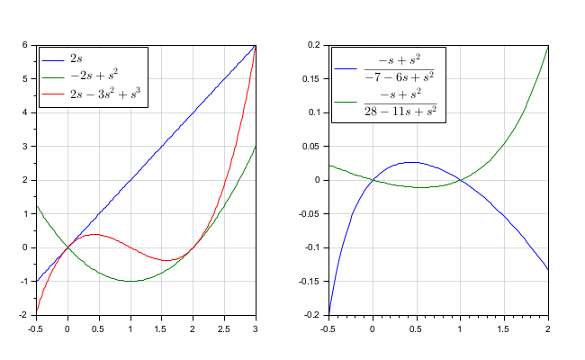 clf s = %s; // Polynomials x = -0.5:0.02:3; p = s*[2 ; (s-2) ; (s-1)*(s-2)] subplot(1,2,1) plot(x, p) legend(prettyprint(p,"latex","",%t), 2); // Rationals x = -0.5:0.02:2; r = (s-1)*s/(s-7)./[s+1, s-4] subplot(1,2,2) plot(x, r) legend(prettyprint(r,"latex","",%t), 2); gcf().children.grid = color("grey70")*[1 1]; // grids gcf().children.children([1 3]).font_size=3; // legends