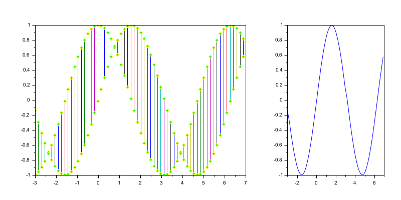 clf subplot(1,3,3) ax3 = gca(); // We will draw here later xsetech([0 0 0.7 1]) // Defines the first Axes area t = -3:%pi/20:7; // Tuning markers properties plot([t ;t],[sin(t) ;cos(t)],'marker','d','markerFaceColor','green','markerEdgeColor','yel') // Targeting a defined axes plot(ax3, t, sin)