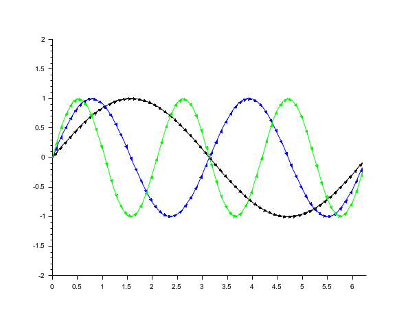 // compare o seguinte com plot2d + .polyline_style=4 clf subplot(2,1,1) x = [0:0.1:2*%pi]'; plot2d4(x,[sin(x) sin(2*x) sin(3*x)]) subplot(2,1,2) e = plot2d(x,[sin(x) sin(2*x) sin(3*x)]) e.polyline_style=4;
