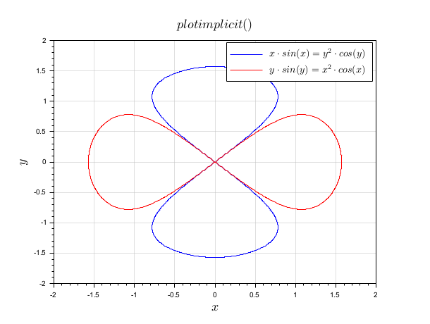 clf h1 = plotimplicit("x*sin(x) = y^2*cos(y)", [-2,2]) t1 = gca().title.text; title("") h2 = plotimplicit("y*sin(y) = x^2*cos(x)", [-2,2], ,"r") t2 = gca().title.text; title("$plotimplicit()$") hl = legend([h1(1) h2(1)],[t1 t2]); hl.font_size = 3; xgrid(color("grey"),1,7)