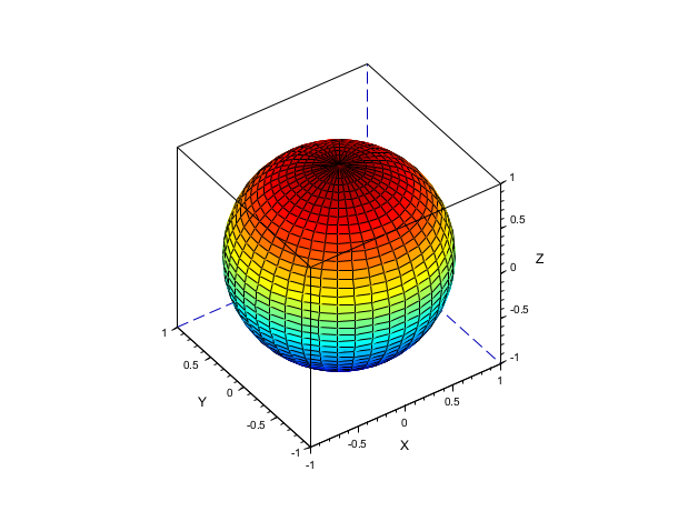 scf(); [x, y, z] = sphere([20 40]); surf(x, y, z); gcf().color_map = parula(64); gca().isoview = "on";
