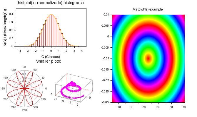 clf subplot(1,2,2) Matplot1() xtitle("Matplot1() example","","") subplot(2,2,1) histplot delete(findobj("type","Legend")) subplot(2,2,3) title("Smaller plots:", "fontsize",3) subplot(2,4,5) polarplot() subplot(2,4,6) param3d() xtitle("","","","")