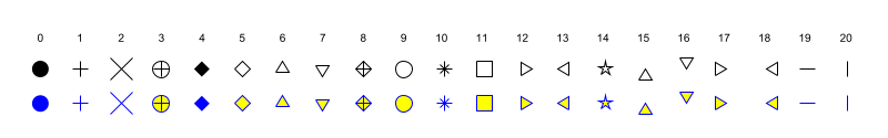 mark_styleproperty value is used to select the type of mark to use whenmark_modeproperty is"on". The value should be an integer in [0 20]. The figure below shows the aspects of the marks depending on themark_styleand themark_foregroundandmark_backgroundproperties.