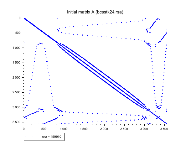 // Example #2 a real example // first load a sparse matrix [A] = ReadHBSparse(SCI+"/modules/umfpack/demos/bcsstk24.rsa"); // compute the factorization Cptr = taucs_chfact(A); // retrieve the factor at scilab level [Ct, p] = taucs_chget(Cptr); // plot the initial matrix scf(0); clf PlotSparse(A) ; xtitle("Initial matrix A (bcsstk24.rsa)") // plot the permuted matrix B = A(p,p); scf(1); clf PlotSparse(B) ; xtitle("Permuted matrix B = A(p,p)") // plot the upper triangle Ct scf(2); clf PlotSparse(Ct) ; xtitle("The pattern of Ct (A(p,p) = C*Ct)") // retrieve cnz [OK, n, cnz] = taucs_chinfo(Cptr) // cnz is superior to the realnumber of non zeros elements of C : cnz_exact = nnz(Ct) // do not forget to clear memory taucs_chdel(Cptr)