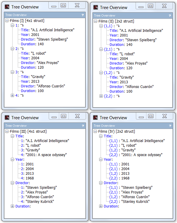clear films films(1) = struct("Title", "A.I. Artificial Intelligence",.. "Year", 2001, .. "Director", "Steven Spielberg", .. "Duration", 140); films(2) = struct("Title", "I, robot", .. "Year", 2004, .. "Director", "Alex Proyas", .. "Duration", 120); films(1,2) = struct("Title", "Gravity", .. "Year", 2013, .. "Director", "Alfonso Cuarón", .. "Duration", 100); films(2,2) = struct("Title", "2001: A space odyssey", .. "Year", 1968, .. "Director", "Stanley Kubrick", .. "Duration", 141); tree_show(films(:),"Films (I)"); tree_show(films ,"Films (II)"); tree_show(films(:),"Films (III)", , %t); tree_show(films ,"Films (IV)" , , %t);