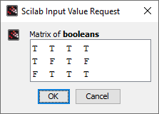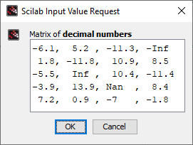 Edits a matrix in a modal way: Scilab is paused while the matrix is displayed and the user can modify it. One of both buttons "OK" or "Cancel" must be clicked to validate or cancel modifications. Either the modified matrix or [] is returned accordingly. Then Scilab resumes the execution of next instructions.
