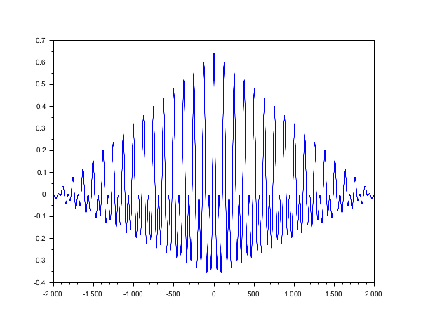 t = linspace(0, 100, 2000); y = 0.8 * sin(t) + 0.8 * sin(2 * t); [c, ind] = xcov(y, "biased"); plot(ind, c)