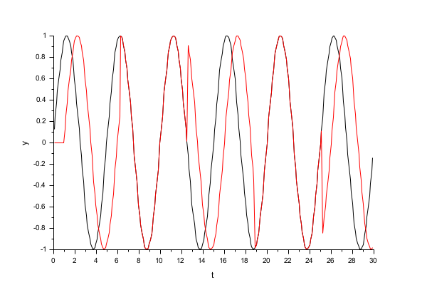 In this example, the sine function (in black) est delayed alternatively by 0 and 1 second. The amplitude of the GENSQR_f block is fixed at 2, but the "Max delay" parameter of the DELAVV_f block restrains that value to 1. We see that with every time GENSQR_f is activated (every 2*π seconds), the delay changes: the curves overlap (delay=0) and are shifted (delay=1) in turn.