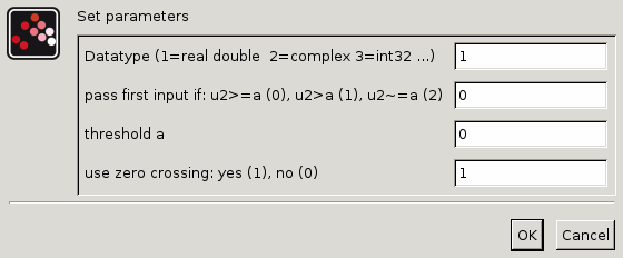 Select the conditions under which the first input is passed. You can make the block check whether the control input is greater than or equal to the threshold value, purely greater than the threshold value, or nonzero. If the control input meets the condition set in this parameter, then the first input is passed. Otherwise, the third input is passed.