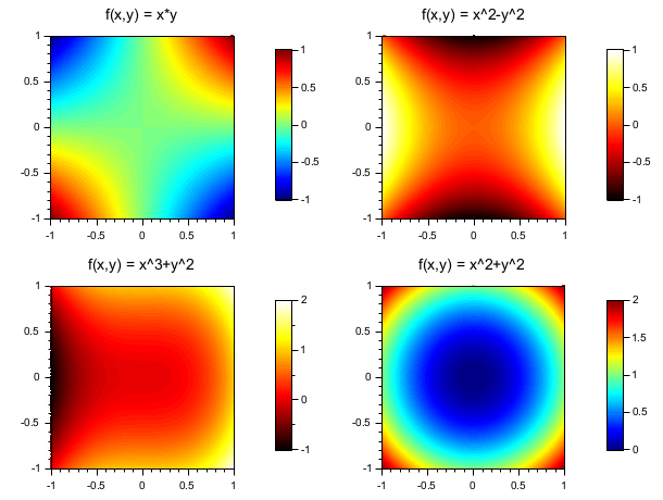 // Пример №1: построение 4 поверхностей function z=surf1(x, y), z=x*y, endfunction function z=surf2(x, y), z=x^2-y^2, endfunction function z=surf3(x, y), z=x^3+y^2, endfunction function z=surf4(x, y), z=x^2+y^2, endfunction clf() set(gcf(),"color_map",[jet(64);hot(64)]) x = linspace(-1,1,60); y = linspace(-1,1,60); drawlater(); subplot(2,2,1) colorbar(-1,1,[1,64]) Sfgrayplot(x,y,surf1,strf="041",colminmax=[1,64]) xtitle("f(x,y) = x*y") subplot(2,2,2) colorbar(-1,1,[65,128]) Sfgrayplot(x,y,surf2,strf="041",colminmax=[65,128]) xtitle("f(x,y) = x^2-y^2") subplot(2,2,3) colorbar(-1,2,[65,128]) Sfgrayplot(x,y,surf3,strf="041",colminmax=[65,128]) xtitle("f(x,y) = x^3+y^2") subplot(2,2,4) colorbar(0,2,[1,64]) Sfgrayplot(x,y,surf4,strf="041",colminmax=[1,64]) xtitle("f(x,y) = x^2+y^2") drawnow(); show_window()