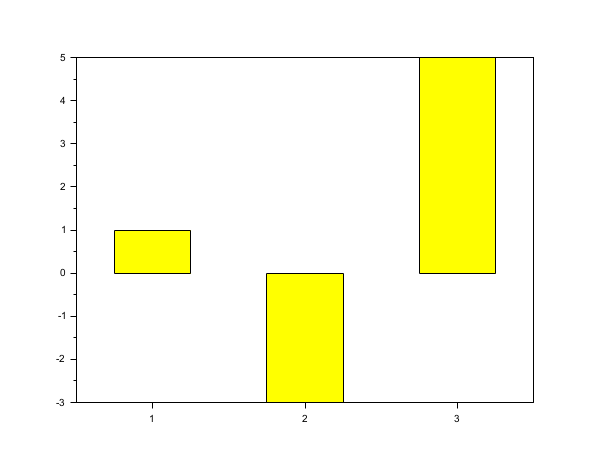 // First example: draw a bar (i.e a polyline with polyline_style type =6) with // width=0.5 and colors='yellow' and default style='grouped', x=1:length(y). scf(0); y=[1 -3 5]; bar(y,0.5,'yellow');