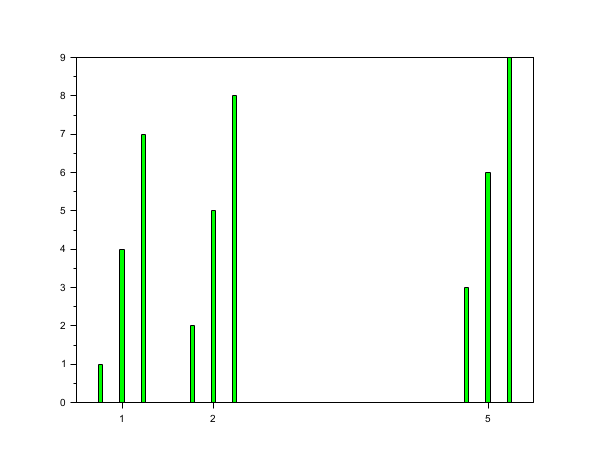 // Fourth example: width=0.2;colors='green'; default style='grouped' scf(3); x=[1 2 5]; y=[1 4 7;2 5 8;3 6 9]; bar(x,y,0.2,'green');