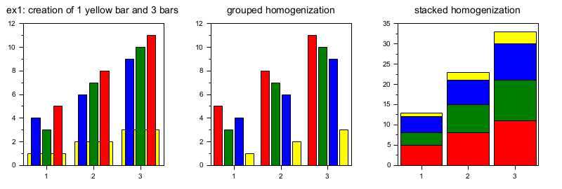 subplot(2,3,1) xtitle('ex1: creation of 1 yellow bar and 3 bars') x=1:3; y1=1:3; y2=[4 3 5;6 7 8;9 10 11]; bar(x,y1,'yellow');bar(x,y2); // grouped homogenization of these 4 bars subplot(2,3,2) xtitle('grouped homogenization') x=1:3; y1=1:3; y2=[4 3 5;6 7 8;9 10 11]; bar(x,y1,'yellow');bar(x,y2); barhomogenize(); // stacked homogenization of the 4 bars subplot(2,3,3) xtitle('stacked homogenization') x=1:3; y1=1:3; y2=[4 3 5;6 7 8;9 10 11]; bar(x,y1,'yellow');bar(x,y2); barhomogenize('stacked',1);