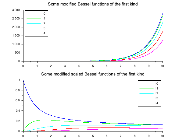 // besselI functions // ----------------- x = linspace(0.01,10,5000)'; clf subplot(2,1,1) plot2d(x,besseli(0:4,x), style=2:6) legend('I'+string(0:4),2); xtitle("Some modified Bessel functions of the first kind") subplot(2,1,2) plot2d(x,besseli(0:4,x,1), style=2:6) legend('I'+string(0:4),1); xtitle("Some modified scaled Bessel functions of the first kind")